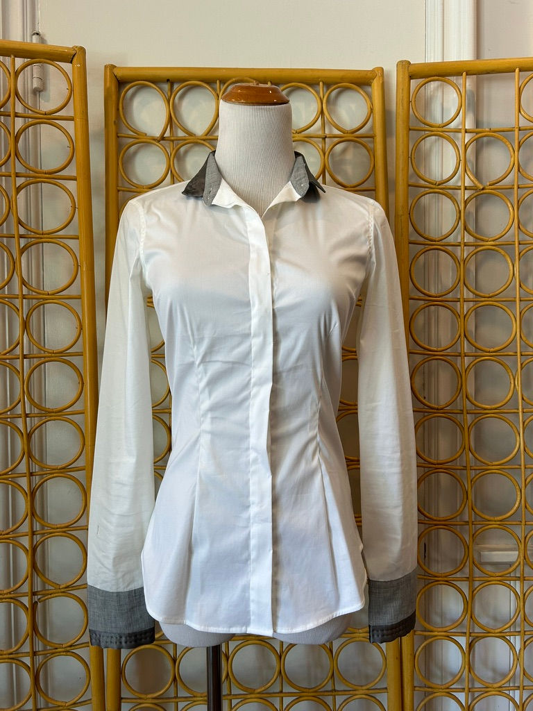 Brunello Cucinelli White Contrast Grey Cuff & Collar Detail Long Sleeve Shirt
